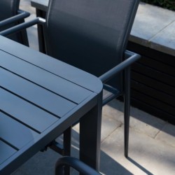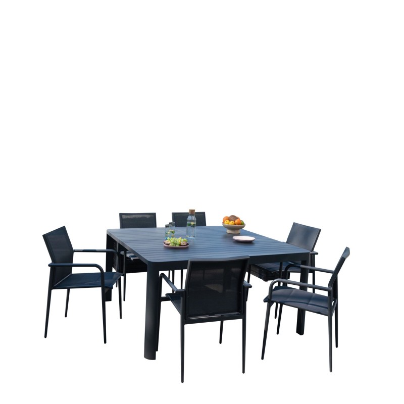 Structure 100 % aluminium anthracite. Table extensible de 97 à 149 cm (rectangle à carrée). Capacité jusqu’à 8 personnes. 6 fauteuils empilables. Assise en textilène ergonomique et aérée Dimensions table : 149 × 149 × 76,5 cm.