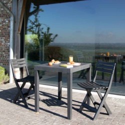 Structure en polypropylène recyclé et recyclable. 2 chaises pliables - 1 table. Dimensions table : 78 × 65 × 72 cm. Dimensions chaises : 78 x 44 x 41 cm.