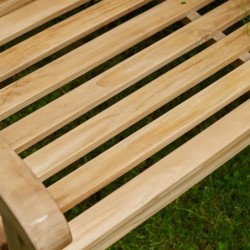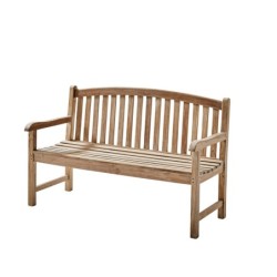 Banc de jardin en bois de teck durable. Style épuré, indémodable et organique. Dossier avec ligne ovale, piétements robustes et accoudoirs travaillés. 2 places. Longueur : 1,20 m. Adapté pour extérieur ou autour d’une table.