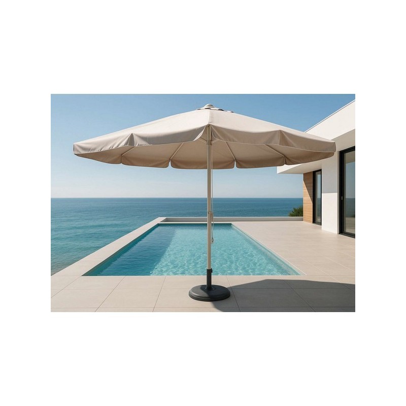Parasol professionnel rond. Diamètre : 500 cm. Structure : aluminium renforcée. Finition structure : Blanc. Système : double poulie + contrepoids intégré (levage facilité). Toit : non inclinable. Toile : fibre acrylique teintée masse – Spéciale parasol pro. Couleur toile : blanc. Grammage toile : 290 g/m2. Résistance UV : classe 7. Propriétés toile : hydrofuge, antitaches, antibrouillard salin, anti moisissure. Entretien : eau + savon neutre – Repassable. Base : fournie sans pied. Mât : diamètre 80 mm – Épaisseur aluminium 5 mm. Baleines : 8 (30 x 20 mm). Délais d'expédition : 10 jours.