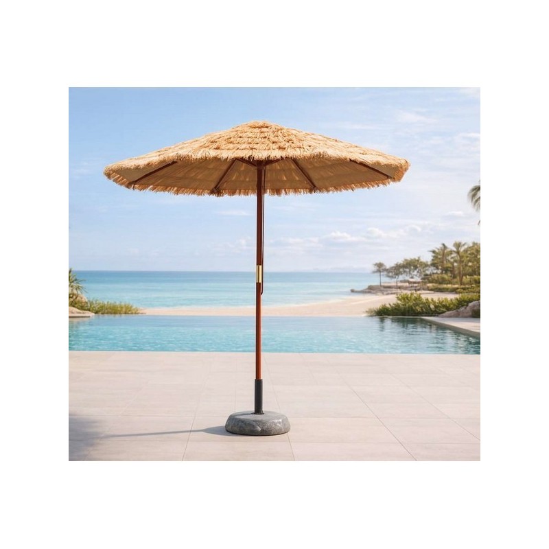 Parasol de jardin. Structure : bois tropical. Baleines : 8. Système ouverture : double poulie Toile : Intérieur : polyester. Extérieur : couverture Rafia. Mât : diamètre 38 mm. Base : pied non inclus. Dimensions : 270 x 270 cm. Délais d'expédition : 10 jours.