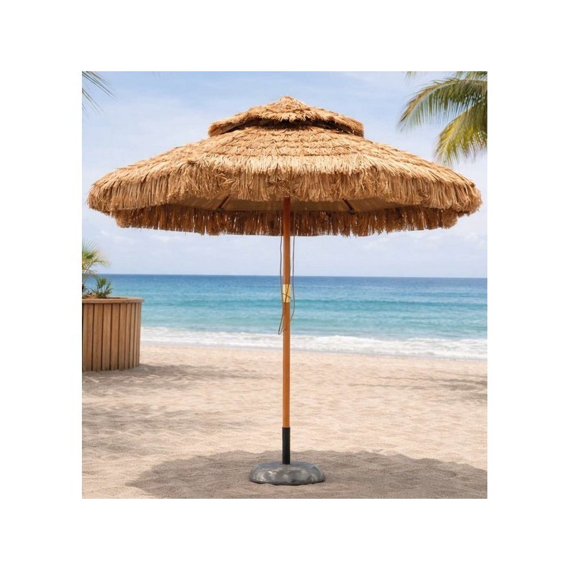 Parasol de jardin. Structure : bois de hêtre renforcé. Baleines : 8. Système ouverture : double poulie. Toile : Intérieur : polyester. Extérieur : couverture Rafia. Mât : diamètre 48 mm. Base : pied non inclus. Dimensions : 270 x 270 cm. Délais d'expédition : 10 jours.