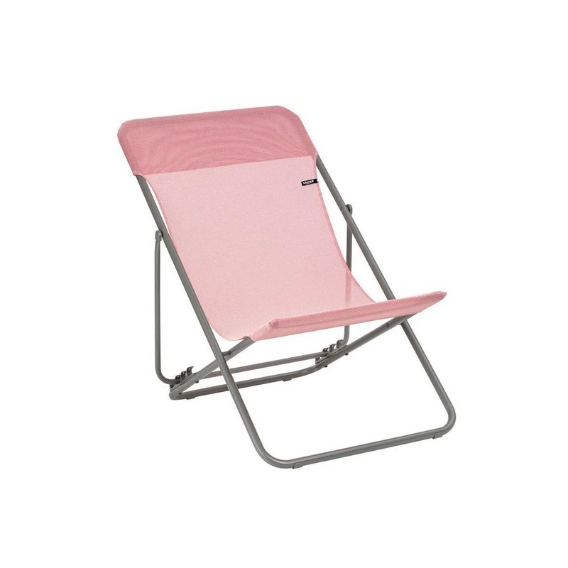 Tube acier HLE 22 mm avec peinture polyester anti-UV. Confort : Absence de traverse à l’avant de l’assise. Toile : Batyline ISO, amovible et remplaçable. Réglage : Dossier inclinable 4 positions. Sécurité : Verrouillage par crémaillères. Stabilité : Patins de protection sur les pieds. Largeur : 58 cm.