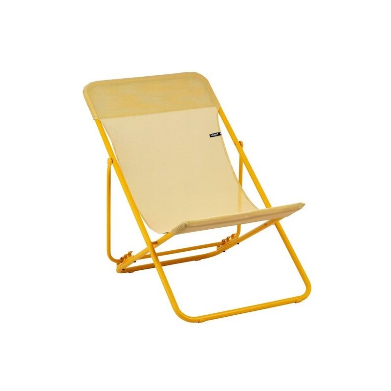 Structure : tube acier HLE 22 mm. Finition : peinture 100% polyester résistante aux UV. Design : pas de traverse à l’avant de l’assise pour plus de confort. Toile : Batyline ISO, amovible et remplaçable. Réglages : 4 positions avec verrouillage par crémaillères de sécurité. Patins de pieds pour protection et stabilité. Largeur : 58 cm.