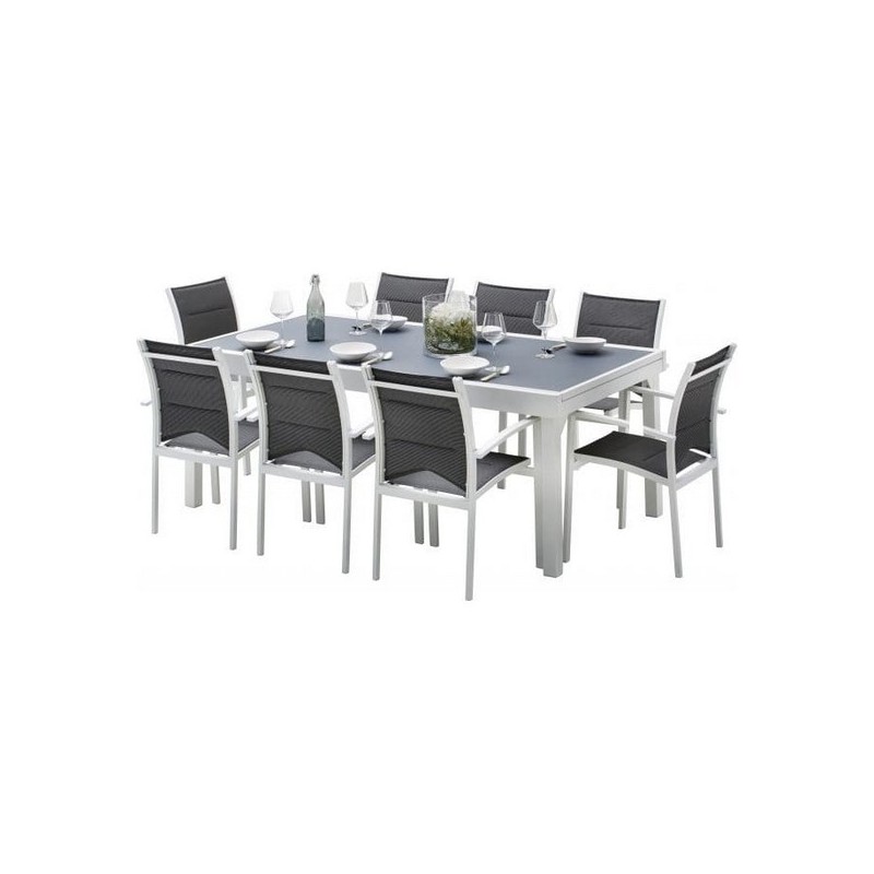 Salon de jardin MODULO 8 à 12 comprenant 1 table en aluminium et verre trempé et 8 fauteuils en aluminium et assise textilène 100% Polyester tressé. Une simple manipulation permet en effet de sortir sans effort les rallonges et de les remettre en place grâce à des guidages très précis. Vous aurez à votre disposition un ensemble pouvant accueillir jusqu'à 12 places dans un confort remarquable. Dim. de la table fermée : H75 x P105 x L 200 cm. Dim. de la table ouverte : H75 x P105 x L 320 cm.