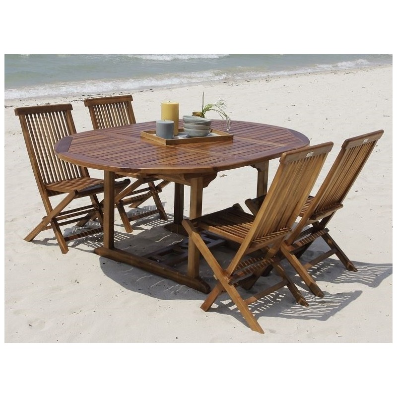 Ensemble Teck Huilé 4/8 comprenant une table en teck Huilé modulable Ovale et 4 chaises en teck huilées.