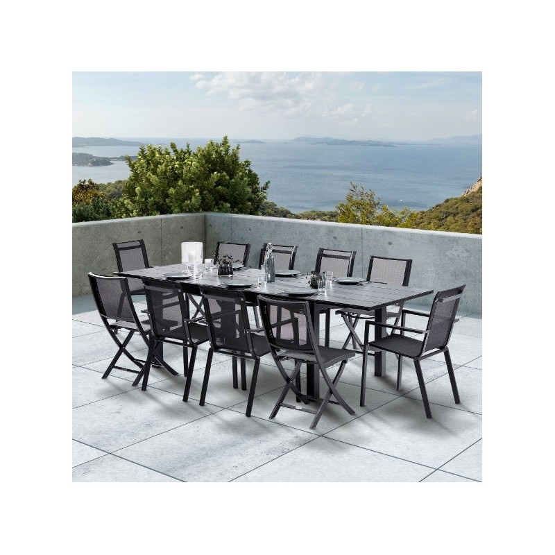 Ensemble HPLStar 6 comprenant 1 table en aluminium et plateau HPL gris clair, 6 fauteuils en aluminium et assise grise en Textilène à séchage très rapide + 4 chaises pliantes BlackStar structure en aluminium blanc, assise textilène Gris.