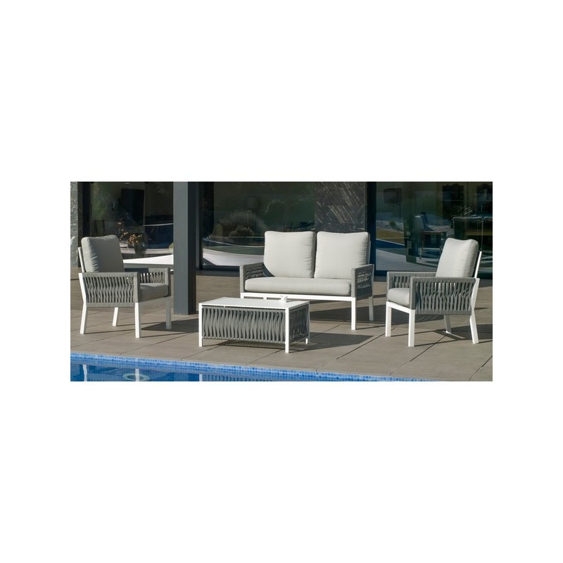 Ensemble de 4 pièces, 4 assises, structure tout aluminium en finition blanc avec un cordage tressé de couleur grise: