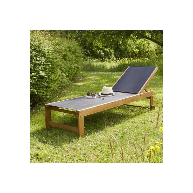 Confort optimal pour ce bain de soleil en bois d'acacia FSC 100% et textilène noir. Inclinable jusqu'à la position allongée. Matière: bois d'acacia.
