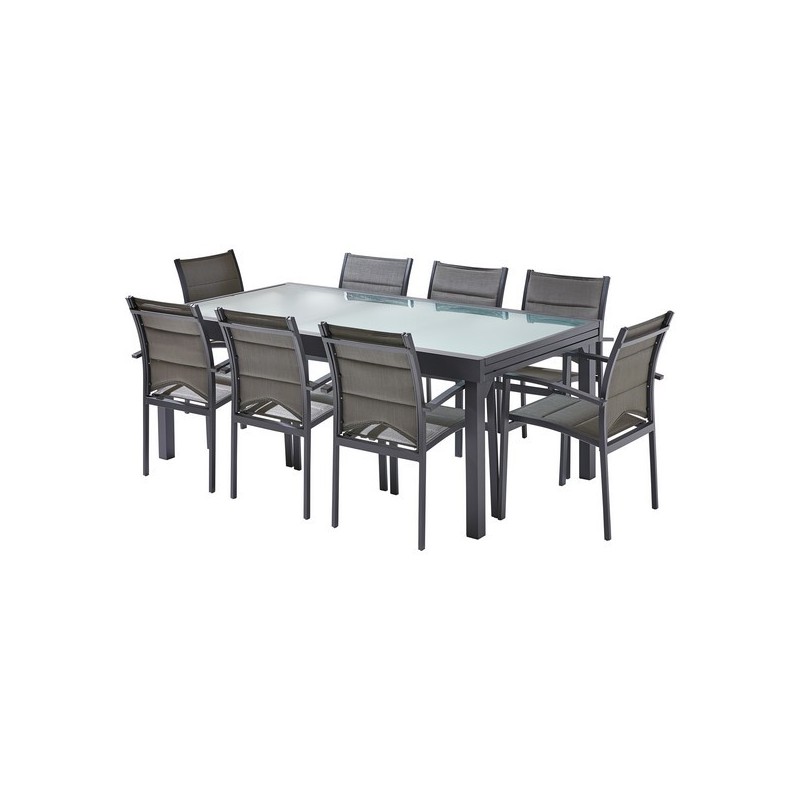 Ensemble 8 à 12 personnes comprenant 1 table en aluminium et verre trempé et 8 fauteuils en aluminium et assise textilène 100% Polyester tressé. Une simple manipulation permet en effet de sortir sans effort les rallonges et de les remettre en place grâce à des guidages très précis. Vous aurez à votre disposition un ensemble pouvant accueillir jusqu'à 12 personnes dans un confort remarquable. Dim. de la table fermée : H75 x P100 x L 200 cm. Dim. de la table ouverte : H75 x P105 x L 320 cm.
