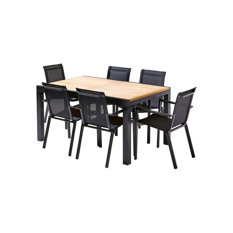 Ensemble 6 places comprenant 1 table en aluminium noire et plateau en Teck, 6 fauteuils en aluminium et assise noire en Textilène à séchage très rapide. Vous aurez à votre disposition un ensemble pouvant accueillir jusqu'à huit convives dans un confort remarquable. Dim. de la table fermée: H76 x P100 x L 150 cm. Dim. de la table ouverte: H76 x P100 x L 240 cm.