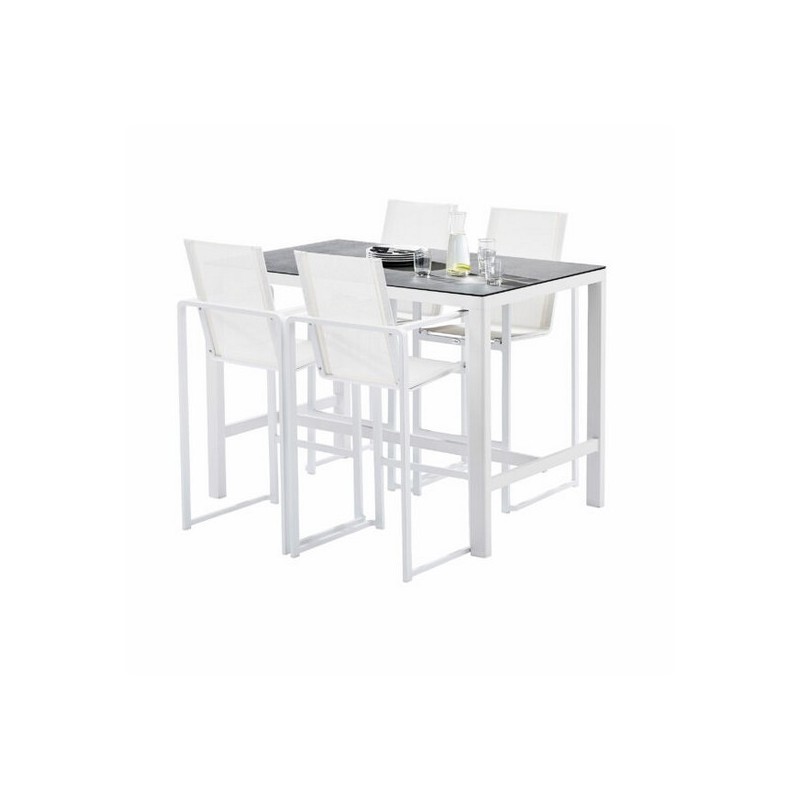 Ensemble Bar de jardin en aluminium, toile en textilène. Le dessus du bar est en verre trempé finition aspect pierre. Les fauteuils sont empilables. L'ensemble est composé d'une table et de 4 fauteuils. Les accoudoirs des fauteuils sont incrusté de teck. Dimension de la table : 92 x 152 x 105. Dimensions d'un fauteuil : 52 x 57 x 122.