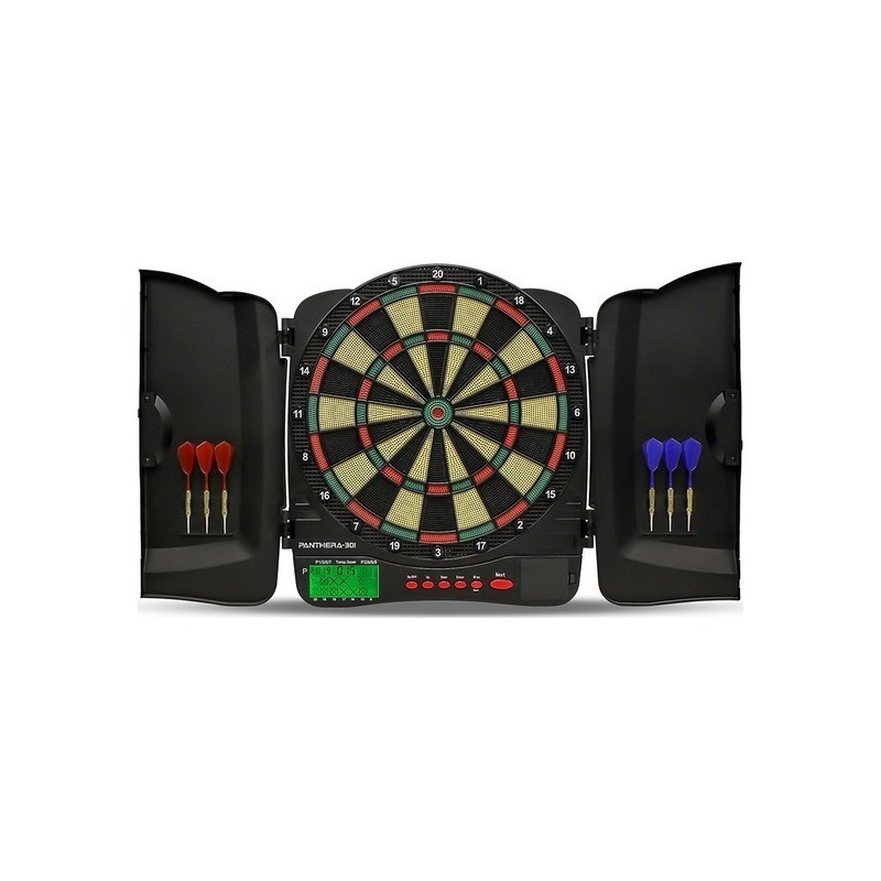 21 jeux avec 595 niveaux de variation. 8 joueurs avec affichage indépendant. Compteur de points pour cricket. Arrêt automatique + option handicap. Effets sonores avec large anneau périphérique de récupération des fléchettes. Livré avec : 6 fléchettes pointes plastiques, 1 lot de 20 pointes plastiques, notice d’utilisation. Fonctionne avec 3 piles AA, non fournies. Dimensions : 45 x 40 x 3 cm.