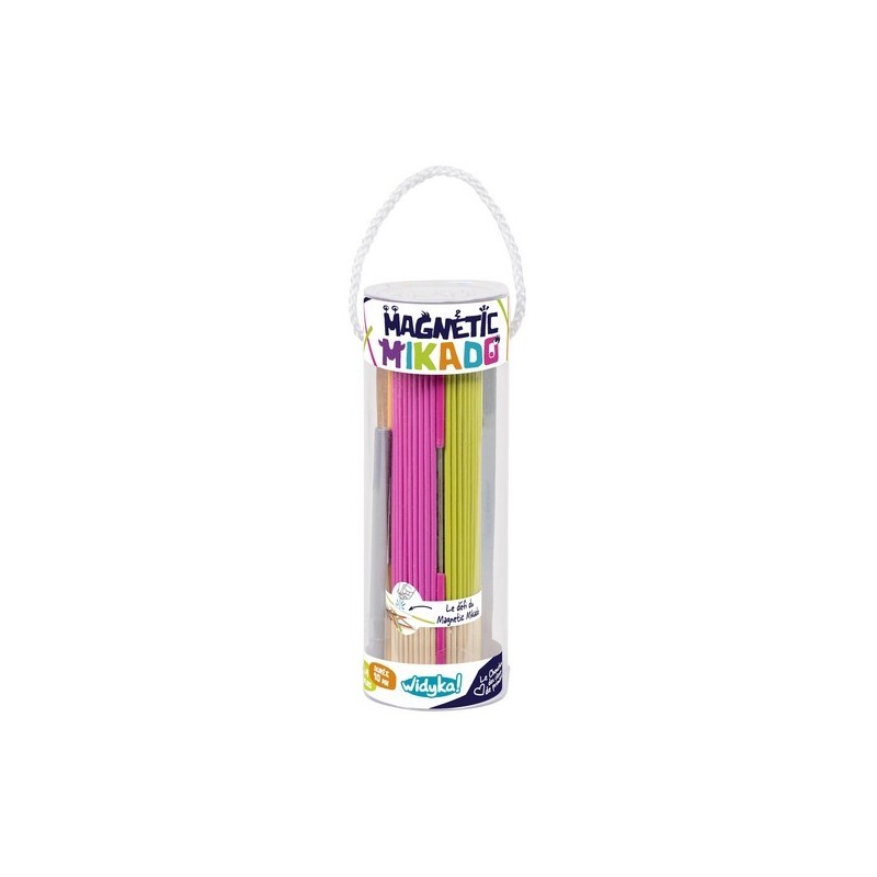 Jeu d'adresse avec baguettes aimantées. Nombre de joueurs : 2 à 4 ans. Âge : dès 6 ans. Durée d'une partie : 10 min. Retirer les mikados sans bouger les autres, ou capturer les pièces métalliques avec le stylet aimanté. Contenus de la boîte : 40 mikados en bois, 4 mikados métalliques,1 stylet aimanté, 1 sac de rangement, règle du jeu.