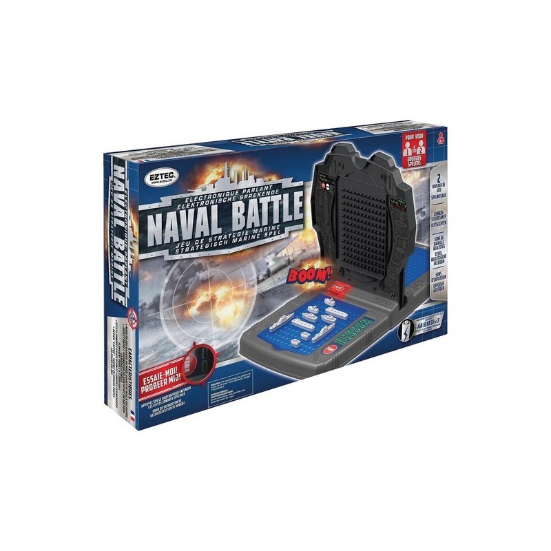 Âge : dès 6 ans. Durée d'une partie : 15 min. Version parlante et électronique du grand classique de la bataille navale. Jeu pour 1 à 2 joueurs, avec effets sonores et lumineux réalistes. 2 modes de jeux. 4 langues : Français, Italien, Néerlandais, et Allemand. Le jeu s’arrête automatiquement après un certain temps d’inactivité. Un espace de rangement est intégré sous les grilles pour stocker les pions et les navires. Contenu de la boîte : 2 grilles 'océan', 2 grilles 'cible', 10 navires en plastique, 80 pions rouge, 200 pions blancs, une notice avec les règles du jeu. Fonctionne avec 3 iles non incluses.