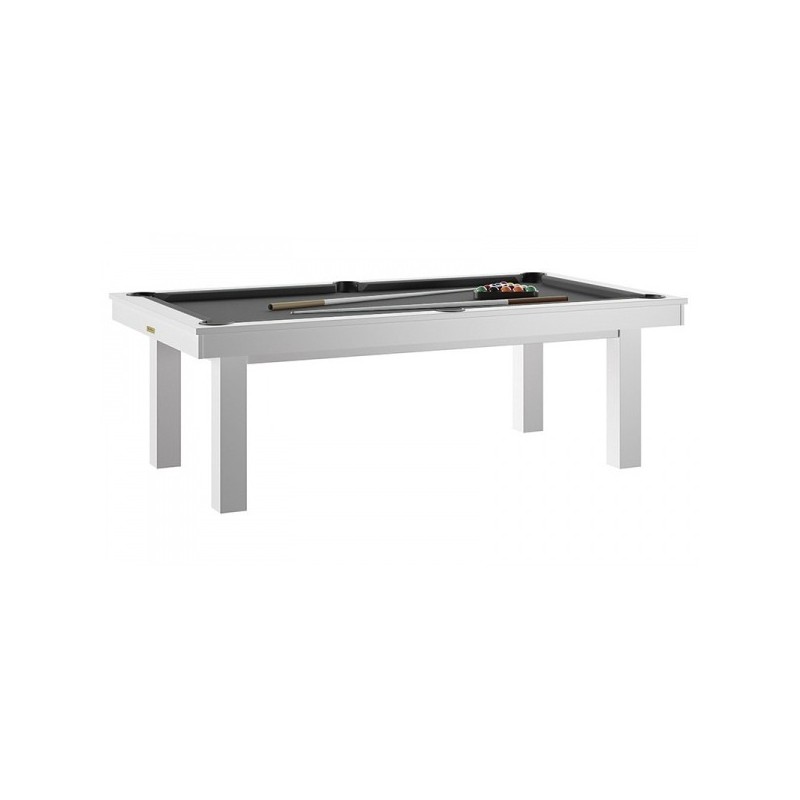 Véritable billard transformable en table de couleur blanc brillant. Réceptacles de billes incorporés. Pieds en bois massif sur vérin de réglage. Accessoires de jeu (16 billes numérotées diamètre 57 mm, triangle, 2 queues, craie. Fabrication française. Dimensions : L203 x P116 cm . Livraison RDC/ pas de porte. délai de livraison sous 6 semaines.