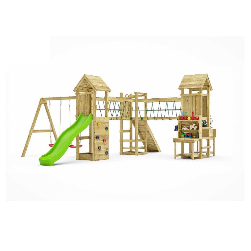 Toboggan : vert, longueur 2,2 m. Hauteur plateforme : 125cm. Structure de sécurité : ancrages au sol Éléments de jeu : cordes de balançoire réglables, 2 sièges de balançoire, roue motrice rouge, télescope jaune, cloche jouet, téléphone jouet, module de cuisine avec évier, jardinière sur le module de table, table de pique-nique intégrée pour jeu imaginatif, pont de liaison en filet, passerelle d’escalade, mur d’escalade avec 6 rochers, cordes d’escalade, poignées de support, toit en bois. Accessoires fournis : kit d’outils d’assemblage à faire soi-même, coupelles à boulons, supports métalliques pour balançoire, manuel de bricolage illustré étape par étape Matériaux : bois de pin sylvestre autoclave, classe 3, certifié FSC. Age d'utilisation : 3 ans et plus. Nombre autorisé d’utilisateurs : 15. Dimensions : 612 x 578 x 257cm.