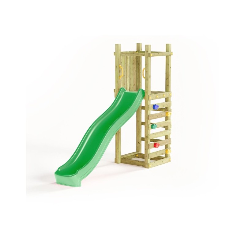 Toboggan vert, longueur 2,2 m. Structure de sécurité : 10 ancrages au sol. Éléments de jeu : échelle en métal, poignées, capuchons, pont complet avec cordage, rampe d’accès avec corde, bac à sable, 6 rochers pour mur d’escalade. Accessoires fournis : kit bois complet, kit de crochets pour balançoire, 2 sièges rouges, ensemble d’outils d’installation, instructions détaillées étape par étape avec règles de sécurité. Matériaux : bois softwood traité sous pression, certifié FSC. Dimensions : 5,25 m × 3,98 m × 2,1 m. Hauteur de la plateforme : 1,25 m. Surface au sol occupée : 20,9 m2. Age d'utilisation : 3 ans et plus Capacité maximale : 9 utilisateurs.