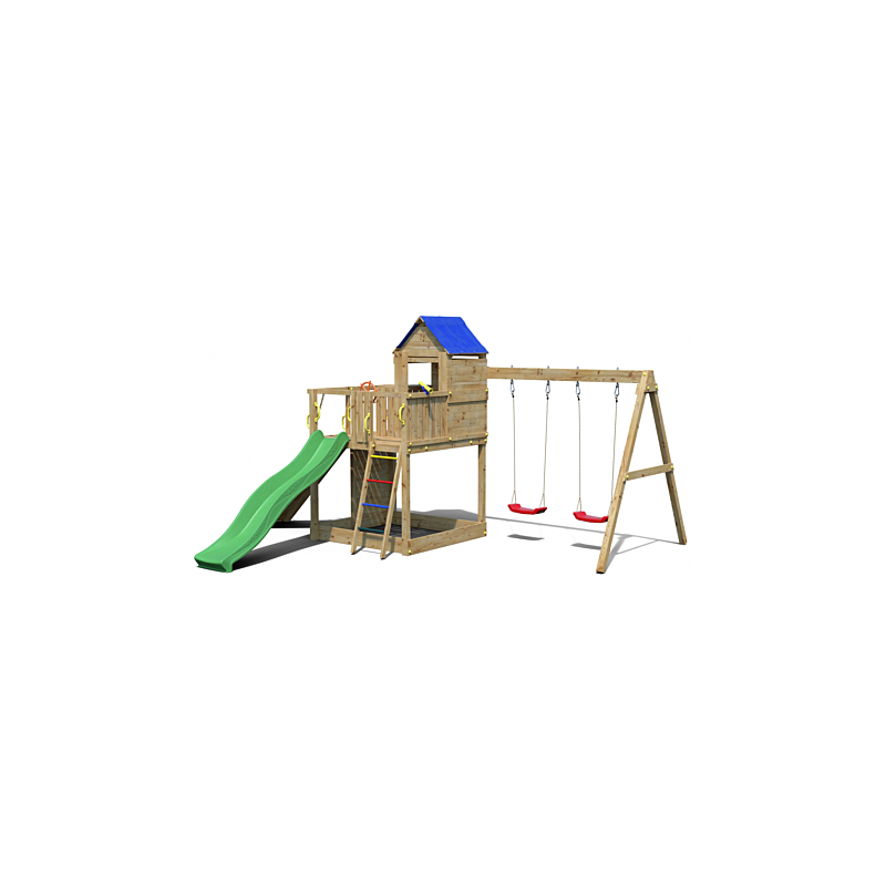Toboggan vert, longueur 2,2 m. Structure de sécurité : ancrages au sol. Éléments de jeu : échelle en métal, poignées, capuchons, volant, télescope, bac à sable, cabane pour enfants avec toiture synthétique waterproof, rampe d’accès avec corde, 6 rochers pour mur d’escalade. Accessoires fournis : kit bois complet, kit de crochets pour balançoire, 2 sièges rouges, ensemble d’outils d’installation, instructions détaillées “étape par étape” avec règles de sécurité. Matériaux : bois de pin sylvestre autoclave, classe 3, certifié FSC. Dimensions : 4,43 m × 5,01 m × 2,72 m. Hauteur de la plateforme : 1,25 m. Surface au sol occupée : 22,19 m2. Capacité maximale : 12 utilisateurs.