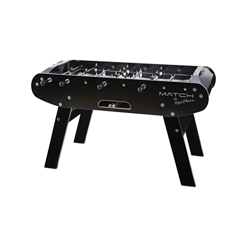 Baby-Foot type 'café', meuble compact et stable en panneau décor noir brillant. Pieds en panneau renforcé enrobé avec renforts en métal. Joueurs en métal décorés main, vissés sur barres en acier chromé. Paliers de glisse en métal avec amortisseurs en acier trempé. Poignées en ABS rondes ou longues, au choix. Poids : 80 kg. Dimensions : 155 x 98 x 90 cm. Livré RDC, pas de porte.
