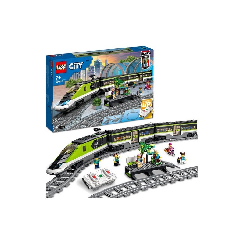 Tout le nécessaire pour construire la locomotive à grande vitesse avec phares fonctionnels à intensité variable, un wagon-restaurant, un wagon de voyageurs et un quai de gare, ainsi que 24 rails et 6 minifigurines.