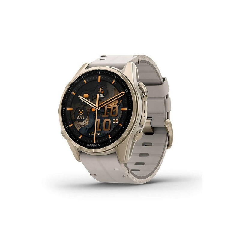 Boîtier : 43 mm, forme ronde, polymère renforcé avec fond titane et lunette titane. Écran : AMOLED tactile 1,3 pouces, résolution 416 × 416 pixels. Bracelet : cuir + silicone (largeur 20 mm), boucle ardillon. Mémoire interne : 32 Go. Autonomie batterie : jusqu’à 10 jours en mode montre, jusqu’à 28 h en mode GPS. Connexions : Bluetooth, Wi-Fi. Résistance à l’eau : 10 ATM (100 m). GPS intégré : GPS multi bande (GPS, GLONASS, Galileo). Fonctions sport et santé : cardio poignet, oxymètre de pouls, suivi activité, sommeil, altimètre, boussole, gyroscope. Fonctions intelligentes : notifications smartphone, musique, fonctions téléphone, contrôle vocal.