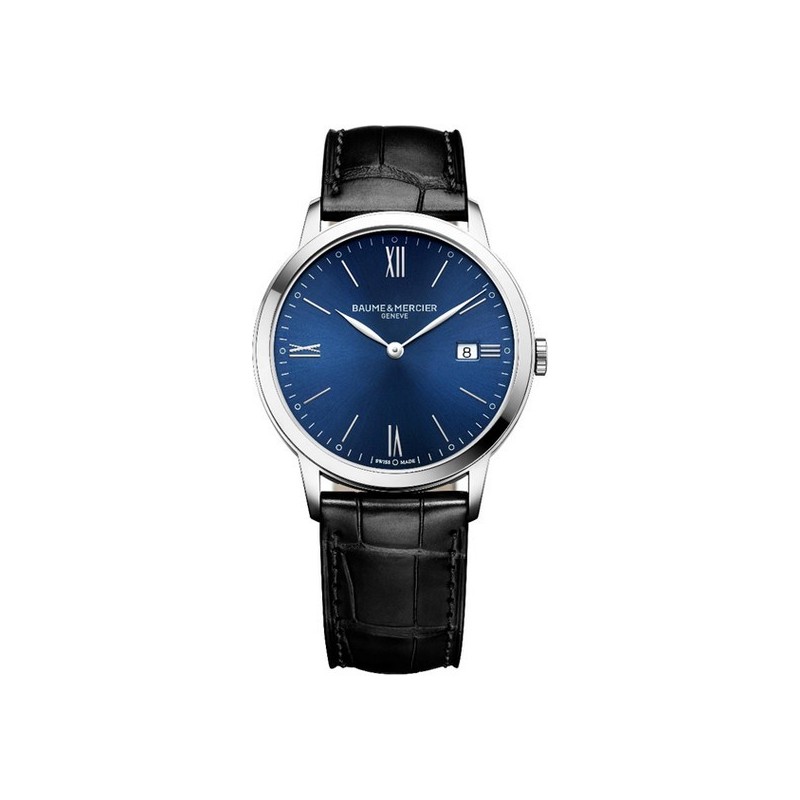Cadran bleu, aiguilles rhodiées, affichage chiffres romains, guichet de date.