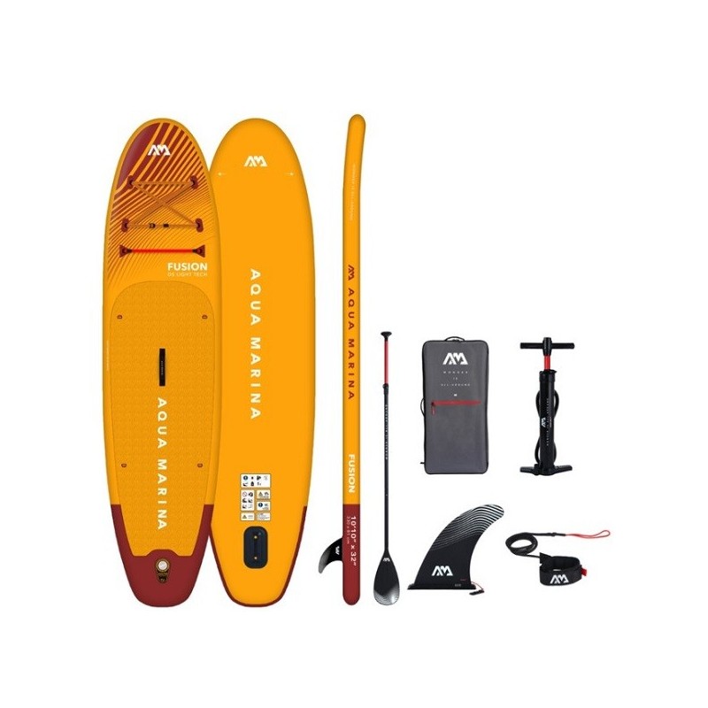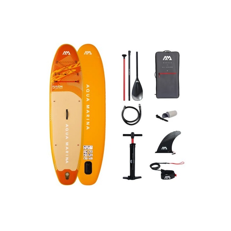 Pack complet avec sup, pagaie, leash, sac à dos, pompe HP, aileron, kit de réparation, bungee de rangement.
