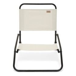 Chaise basse pliable. Cadre en acier thermolaqué. Partie textile en polyester 600D. Poids maximum supporté : 100 kg.