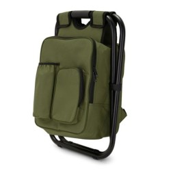 3en1 : sac à dos, sac isotherme et chaise. Capacité isotherme 15 L. 2 poches extérieures sur l’avant et 1 sur l’arrière du sac. Poids maximum supporté : 150 kg. Bretelles du sac à dos réglables. Tissus Nylon Oxford 600D. Cadre en métal.