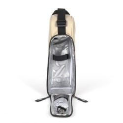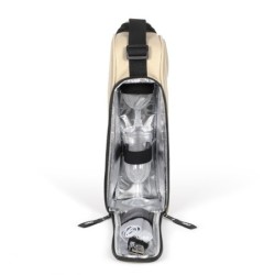 Pour 2 personnes. 1 compartiment isotherme d'une capacité de 2 L pouvant contenir une bouteille de 1,5 L. 1 compartiment isotherme de 2 L comprenant 5 accessoires : 2 verres à vin 18 cl, 2 serviettes en tissu, 1 ouvre-bouteille. Possibilité de mettre une deuxième bouteille de 1,5 L dans le compartiment des accessoires si on ôte les 2 verres. En polyester 600D. Verres compatibles lave-vaisselle.