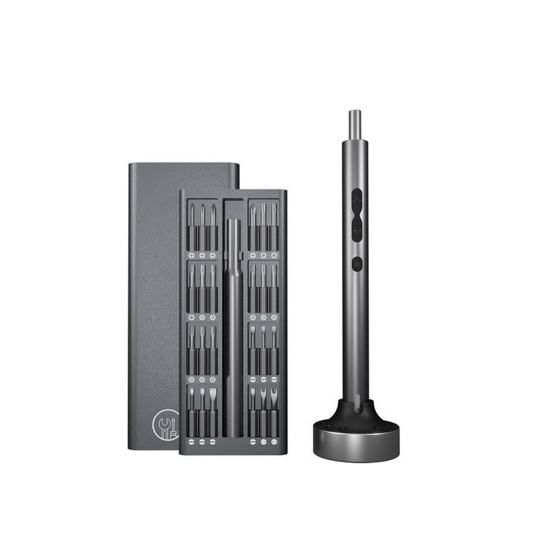 Ce kit outil tout-en-un en aluminium est composé d'un set comprenant 48 embouts et un tournevis de précision manuel, d'un tournevis électrique et d'une base de chargement.