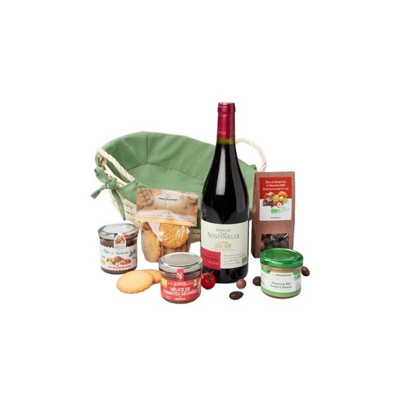 Corbeille osier naturel tissu vert, diamètre 37 cm.