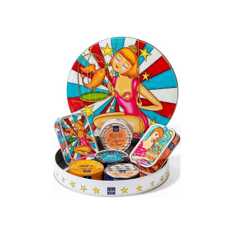 Le coffret comprend : un émietté de thon olive basilic 80g, une rillette de saumon et thon 80g, une tartinette maquereaux moutarde 80g, une mousse de sardines à l'armagnac 80g, 2 boites de sardines millésimées Coralie Joulin 2023 et 2020