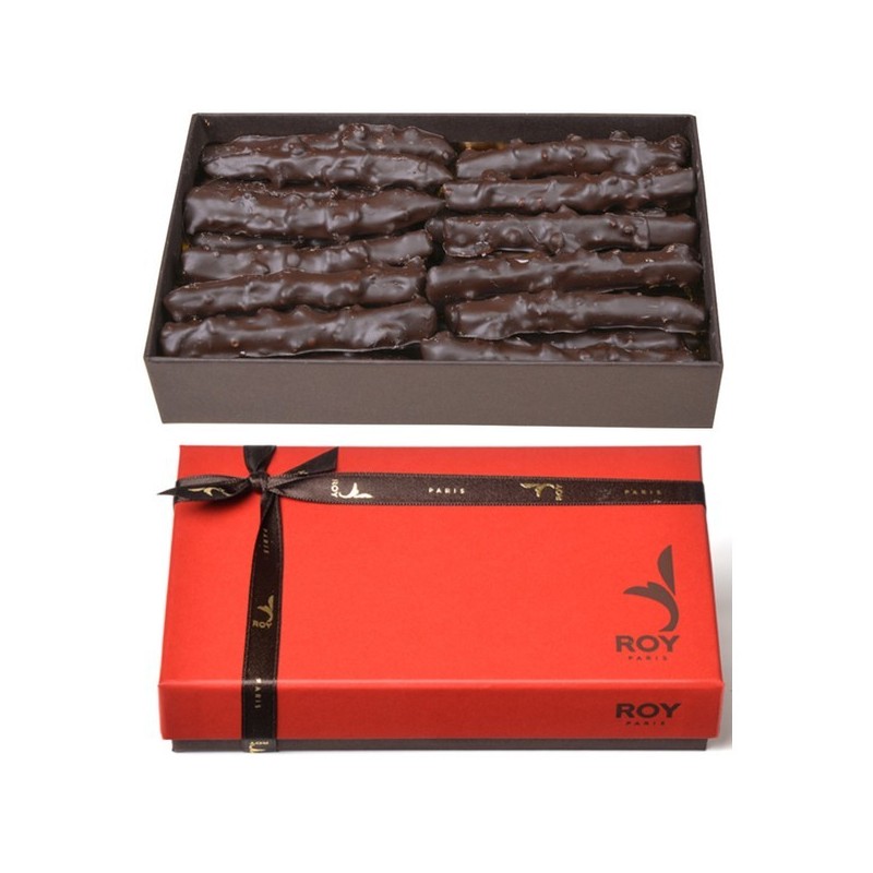 Ecorces d'oranges confites et moelleuses, enrobées de chocolat noir aux eclats de noisettes caramélisées.