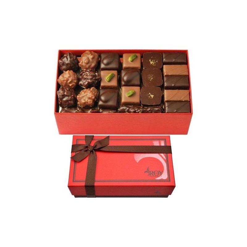 Boite de 550 g avec 59/60 chocolats noir et lait, sans alcool sur 3 niveaux: ganaches aux saveurs douces et intenses, pralinés riches et onctueux.