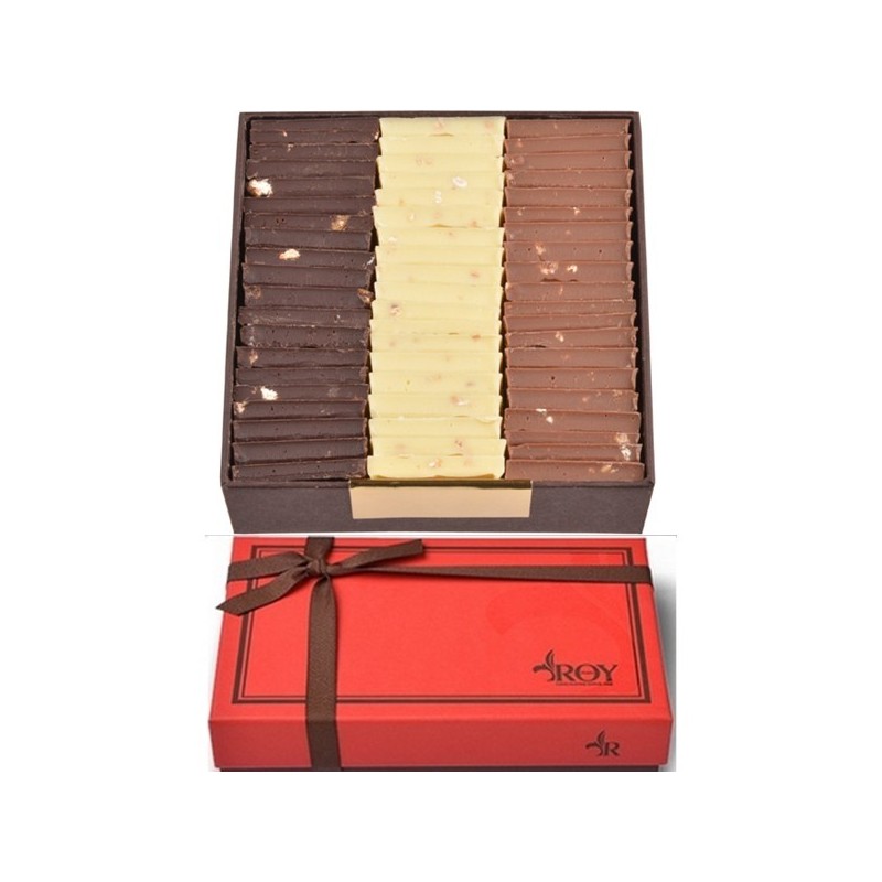 Boite de 200g avec 60 carrés de chocolats, assortiment 3 saveurs.