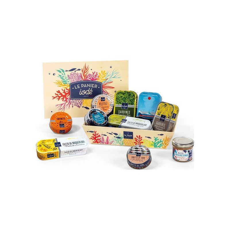 La bourriche comprend : Une boîte de filets de maquereaux à l'huile d'olive 176g. Une boite de filets de maqueraux à la moutarde à l'anciennne 169g. Une boîte de sardines aux olives vertes tranchées et romarin de 115g. Une boîte de sardines au poivre sauvage de Madagascar de 115g. Une boîte de sardines Millésimées Marine Nationale de 115g. Une boîte de rillettes de saumon & thon de 80g. Une boîte de mousse de sardines à l'armagnac de 80g. Une boîte d'émietté de thon & jambon de bayonne de 80g. Une boite de tartinette de thon, carotte et cumin de 80g, Une rillette en bocal verre de thon et piment doux de Kampot 90g. La composition de ce coffret est susceptible d'évoluer selon la disponibilité des produits.