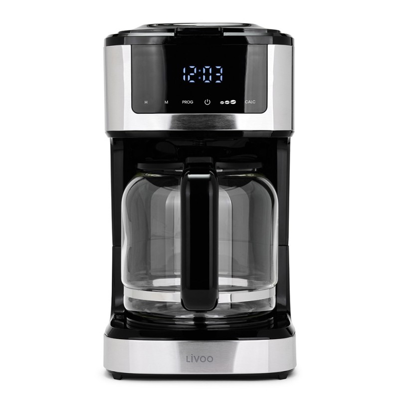 Grande capacité 1,8 L et 12 à 15 tasses. Puissance 900 W. Filtre réutilisable amovible. Fonction programmation (24 heures), maintien au chaud, expresso, rappel de nettoyage. Carafe en verre. Système anti-gouttes. Arrêt automatique 40 minutes après la fin du cycle de café. Affichage LED et tactile. Indicateur de niveau d’eau. 2 pieds anti-dérapant. Carafe en verre et porte-filtre compatibles lave-vaisselle.