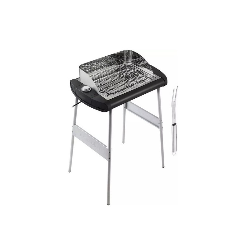 Cuisine saine et diététique : grille innovante permettant de cuire des aliments fragiles ou de petite taille (légumes, poissons…) sans qu’ils ne passent à travers la grille. Pied en acier laqué. Gand pare-vent en acier inoxydable: 9 cm de hauteur. Puissance: 2300 Watts. Barbecue entièrement démontable : bac, grille de cuisson et pare-vent qui passent au lave-vaisselle. Voyant de contrôle de fonctionnement. Large grille de cuisson : 40 x 28 cm. Hauteur de la surface de cuisson: 80 cm. Bac à réserve d’eau en acier inoxydable. - Pic à viande en acier inoxydable inclus. Dimensions: 58 x 38.5 x 9 cm.