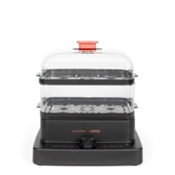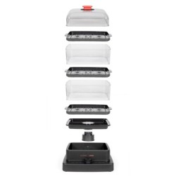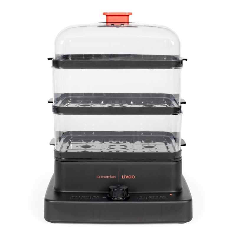 3 paniers vapeur pour une capacité totale de 12L, jusqu’à 8 personnes. Puissance 1000 - 1200 W. Minuteur de 60 minutes avec arrêt automatique et signal sonore de fin. Paniers vapeurs emboitables aux capacités de 3,7L à 4,1L. Couvercle transparent amovible. Production de vapeur dès 30 secondes après la mise en marche. Economie d’énergie via un système qui concentre la chaleur et favorise la libération rapide de la vapeur. Conseils de cuisson intégrés : légumes, viandes, poissons, œufs, riz, fruits. Arrêt automatique à la fin de la minuterie. Indicateur de niveau d’eau. Plateaux et paniers compatibles lave-vaisselle. 4 pieds antidérapants. Avec marmiton.
