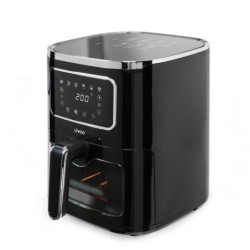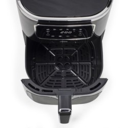 Capacité 5 L. 6 programmes de cuisson pour cuire sainement tous les aliments : steak, ailes de volaille, poisson, frites, dessert, pizza. Puissance 1450 W. Température ajustable de 80 à 200 degré(s)C par palier de 5 degré(s)C. Minuterie jusqu’à 60 min par palier de 1 min. Panneau de commande tactile. Air chaud circulant à 360degré(s). Signal sonore de fin de cuisson. Arrêt automatique. Bac avec revêtement antiadhésif sans PFAS. Fenêtre de cuisson transparente. Eclairage intégré. Poignée thermorésistante. 4 pieds antidérapants. Protection contre la surchauffe. Accessoires inclus : 1 grille compatible lave-vaisselle.