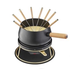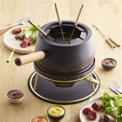 Type : Appareil à fondue électrique. Puissance : 1200 W. Capacité du caquelon : 1,5 L utile ( environ 3 L brut). Thermostat réglable. Nombre de personne recommandé : 8. Interrupteur marche/arrêt avec voyants lumineux. Caquelon en aluminium avec revêtement antiadhésif. Corps et support des pics en thermoplastique. Poignées du caquelon en bois massif. Pics à fondue en acier inoxydable avec manches en bois. Accessoires inclus : 8 pics, support pour pics, housse de rangement. Cordon amovible d’environ 2 m. Dimensions : 23,9 x 30,8 x 29 cm.