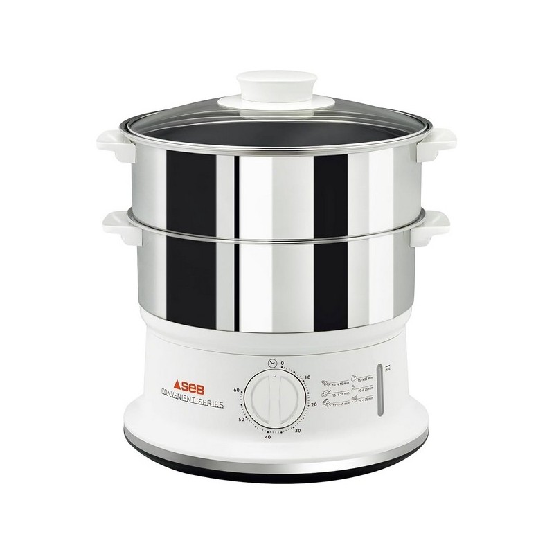 Design moderne, puissance 900 W. 2 bols en acier inoxydable, empilables pour un rangement compact. Minuteur 60 mn avec arrêt automatique. Niveau d'eau visible, couvercle en verre.