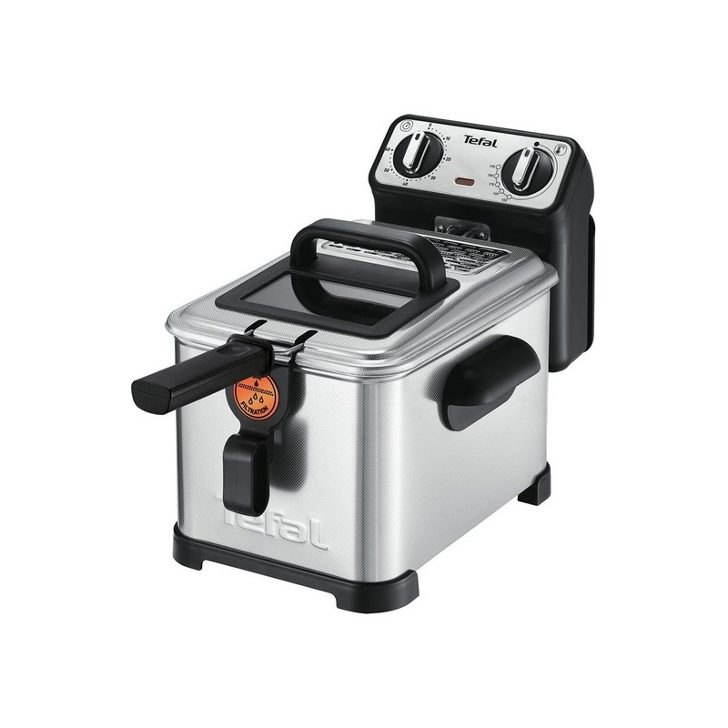 Capacité aliments: 1,3 kg, huile: 4 L. Cuve inox, hublot dans le couvercle de cuisson. Thermostat réglable : 150degré(s) à 190degré(s) C. Zone froide: les résidus se déposent au fond de la cuve, et ne brulent pas grâce à la température inférieure. Système de filtration breveté, filtre métallique permanent. Compatible au lave-vaisselle : cuve, couvercle, panier, filtre. Dimensions : 47,2 x 28,4 x 33,8 cm.