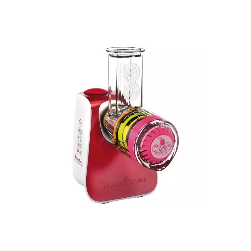 Puissance 150 W. Râpe et tranche, les aliments tombent directement dans votre plat. 5 cônes métalliques renforcés (râper, trancher, émincer), 2 cônes pour trancher gros et fin, 1 cône pour trancher, 1 cône spécial parmesan, 1 cône spécial carottes vichy. Forme ronde ergonomique. Rangement intégré des accessoires. Fabriqué en France.