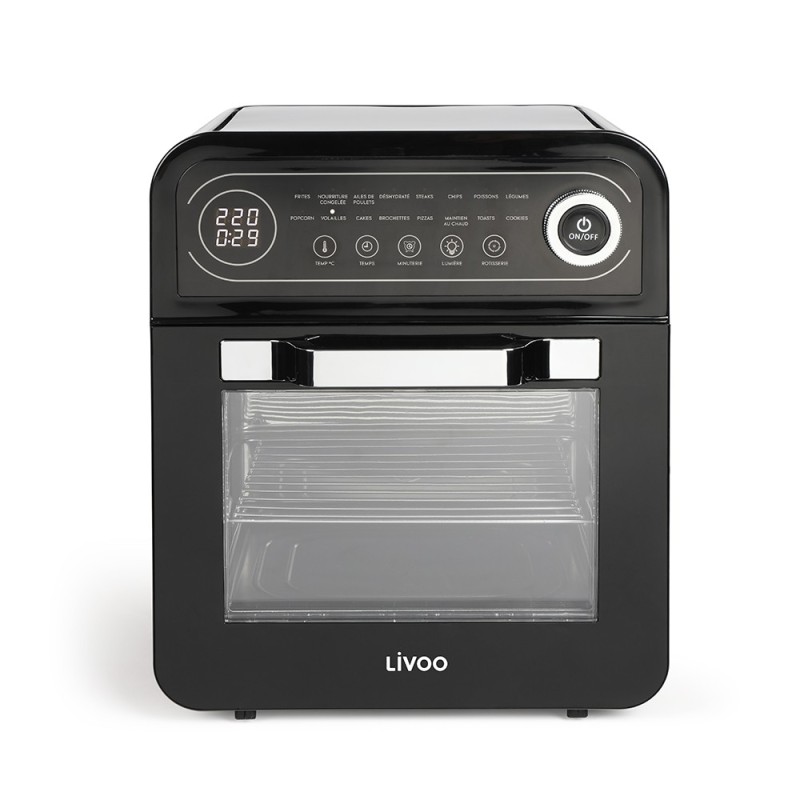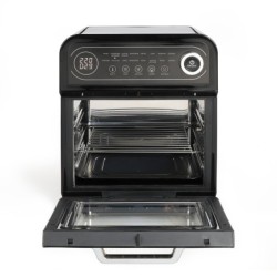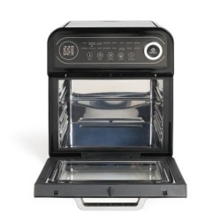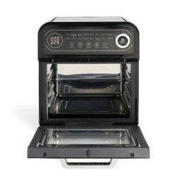 Capacité de 12 L. Cuisson par système de chaleur pulsée. Température ajustable jusqu’à 220degré(s)C. Ecran digital. 16 programmes de préparation pré-enregistrés. Grande capacité avec conception à 3 tiroirs. Bouton rotatif de réglage progressif et panneau de commande tactile. Minuterie jusqu’à 60 minutes avec signal sonore et arrêt automatique. 5 accessoires : Plateau égouttoir, grille, panier en maille, pince à rôtisserie, pince à cage.