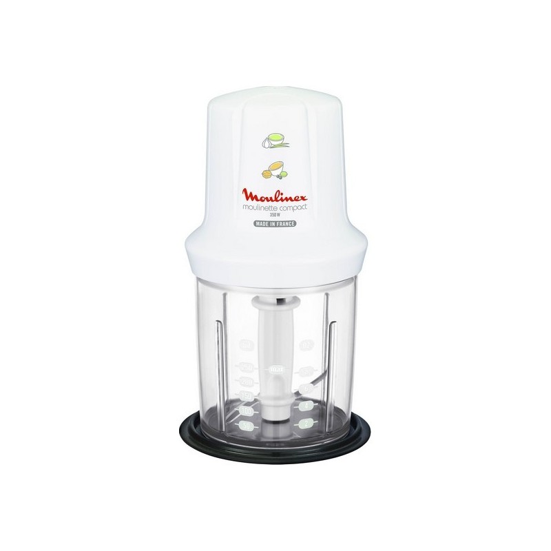 3-en-1: découper, hacher et mixer toutes sortes d'ingrédients. Compact: capacité 250 ml / 200 g, bol gradué, 1 lame acier inoxydable. Fonctionne par simple pression sur le dessus de l'appareil, puissance 350 W. Base anti-dérapante: peut servir de couvercle de conservation pour le bol. Fabriqué en France.