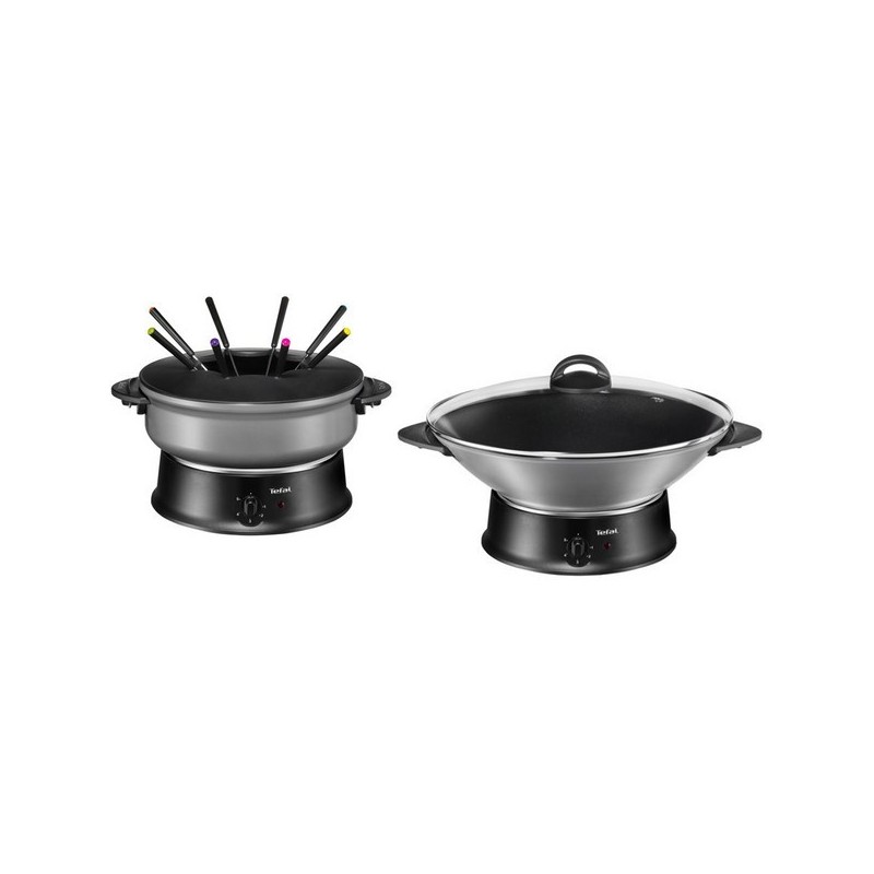 2-en-1: Multi Wok avec couvercle en verre: idéal pour cuire et maintenir au chaud sur la table tous les plats complets du monde entier: paëlla, choucroute, cassoulet... Fondue avec caquelon aluminium à revêtement anti-adhésif et 8 fourchettes à fondue: pour réussir en toute sécurité toutes les fondues à l'huile, au fromage, au bouillon ou au chocolat. Thermostat réglable, 1200 W. Gain de place: le caquelon se range dans le wok. Fabriqué en France.