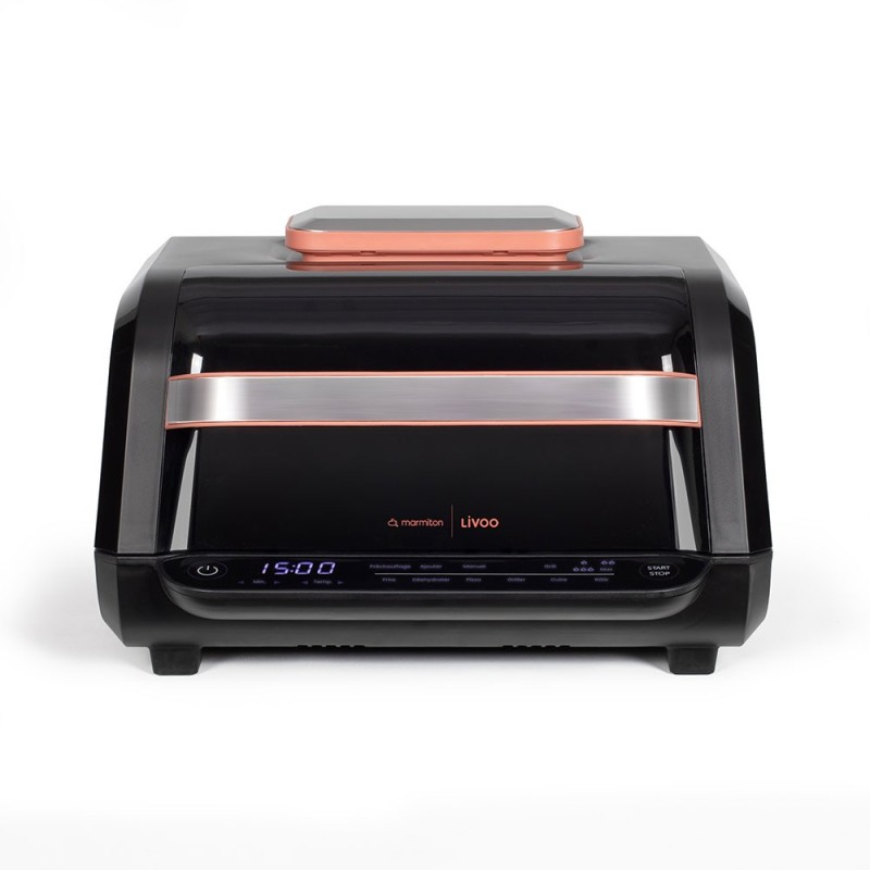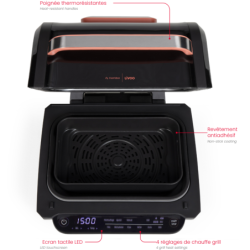Capacité 6 L. Puissance 1500-1700 W. 2 en 1 : mode friteuse sans huile et mode grill l’intérieur. 8 programmes de cuisson : frire sans huile, rôtir, déshydrater, cuire, griller, Pizza, fonction Grill et fonction manuelle. 4 réglages de chauffe du grill : bas, moyen, haut, max. Température ajustable de 50degré(s)C à 230 degré(s)C par paliers de 5 degré(s)C. Minuterie jusqu’à 2 H. Panneau de commande LED tactile. Signal sonore de fin de cuisson, arrêt automatique. Poignée thermorésistante, revêtement antiadhésif, pieds antidérapants. Accessoires inclus : 1 plaque pour grill, 1 panier de cuisson, 1 cuve et une brosse de nettoyage. Marmiton.